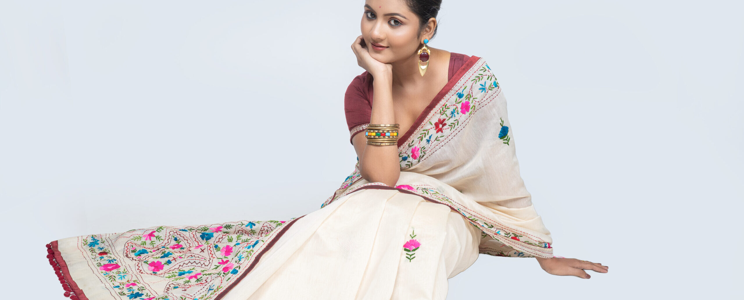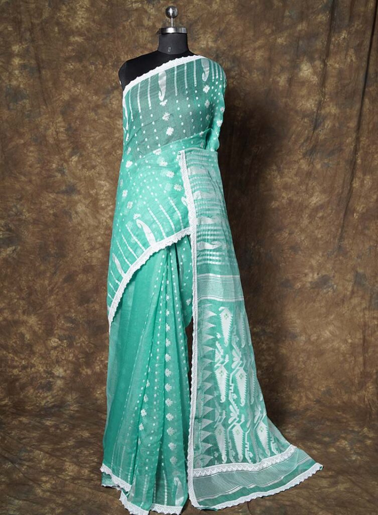 Finely woven Dhakai Jamdani sarees celebrated for their intricate motifs, airy texture, and timeless heritage elegance.