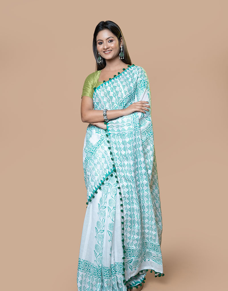 Pure Cotton Printed Saree with Pompom in Blue