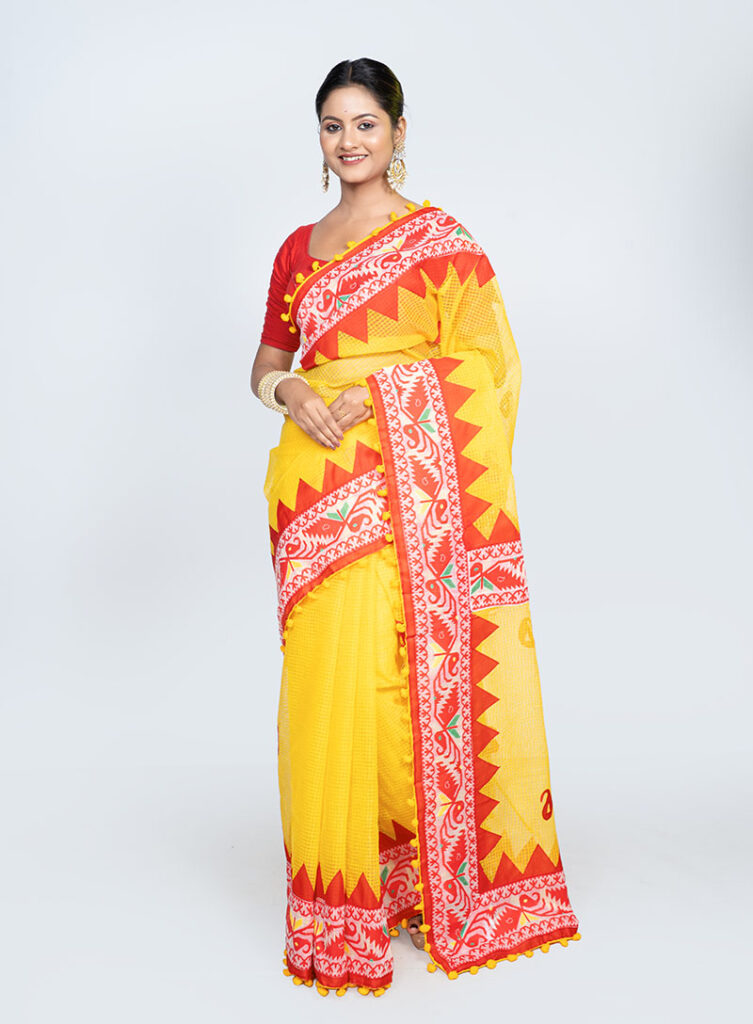 Pure Cotton Printed Saree with Pompom in Red & Yellow