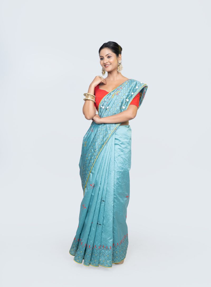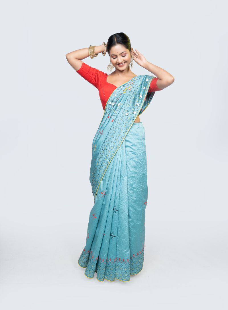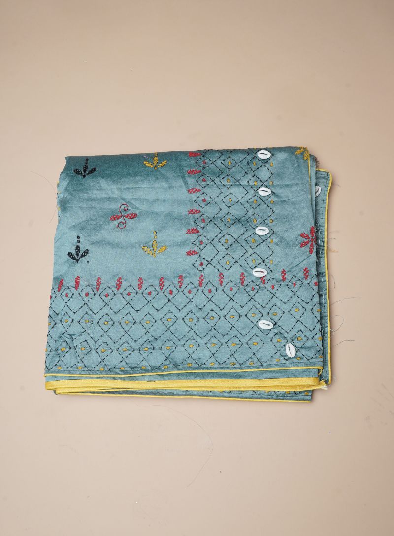 The Lambani embroidery, celebrated for its vivid colors and folk-inspired motifs, brings a handcrafted charm to the saree. The lively yellow and orange threads add warmth and energy against the blue base, making it an ideal choice for festive occasions, cultural gatherings, weddings, and special celebrations.