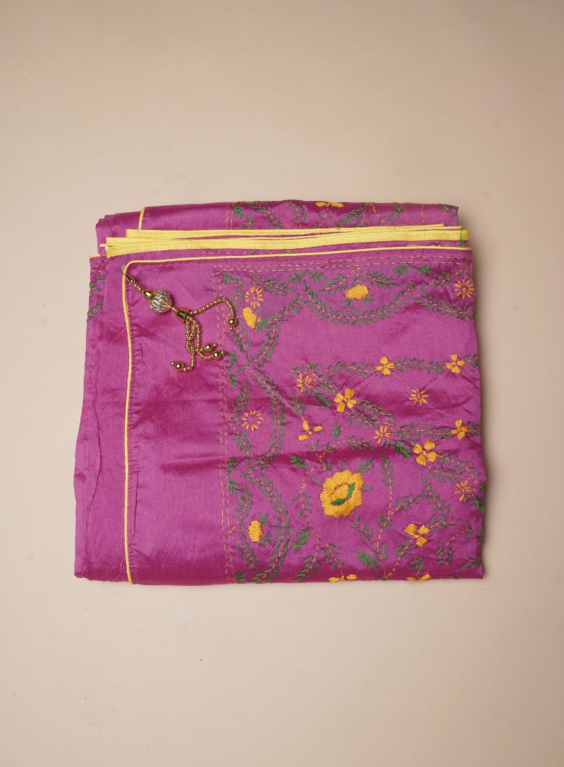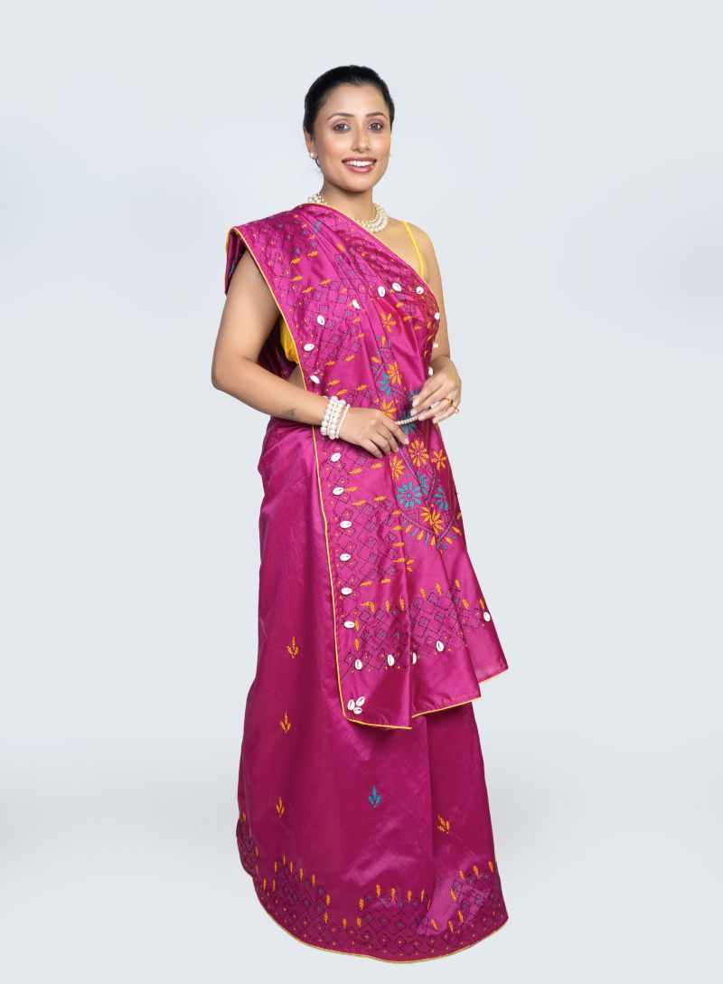 Renowned for its bold patterns and colorful threadwork, Lambani embroidery brings a rich artisanal appeal to the saree. The lively yellow and blue embroidery creates a stunning contrast against the pink base, making it perfect for festive occasions, cultural events, celebrations, and ethnic gatherings.