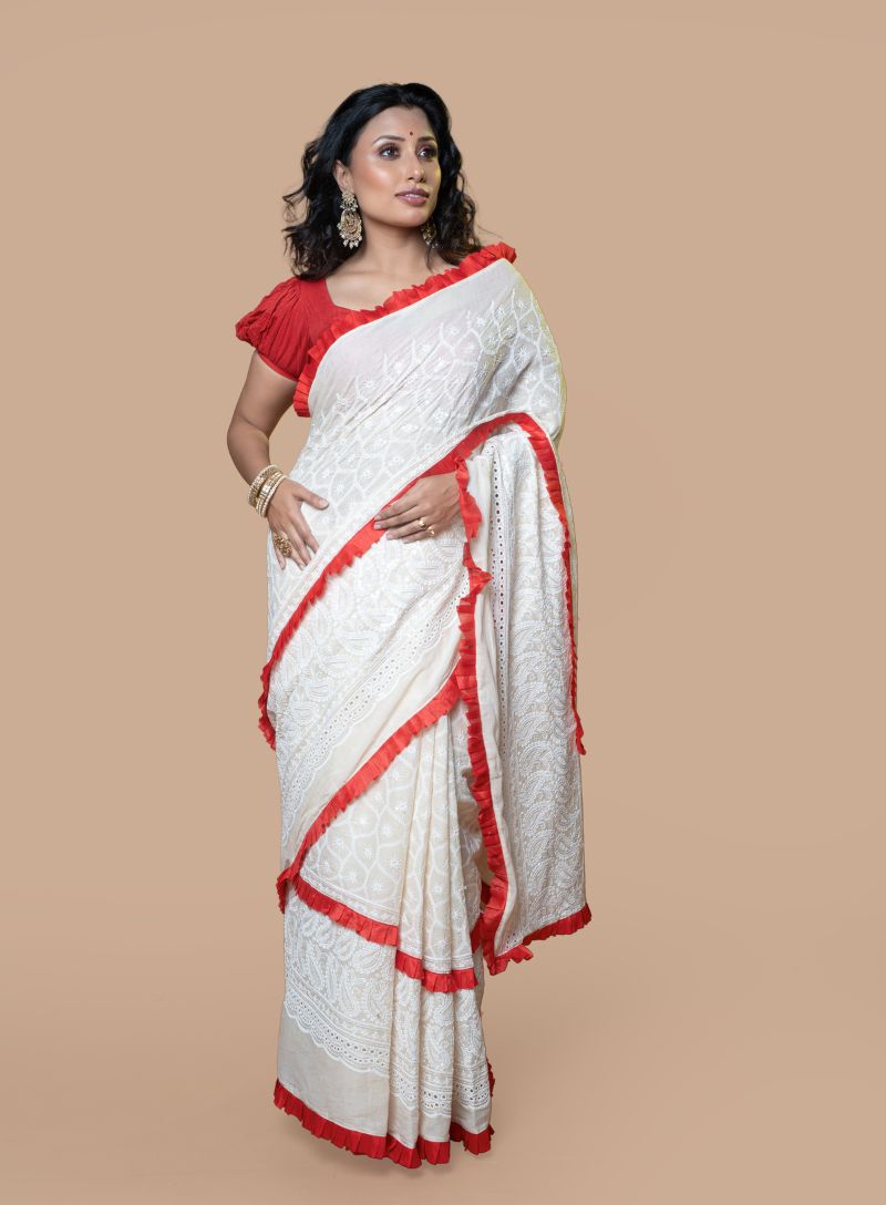 The fine Chikankari work, known for its delicate patterns and handcrafted finesse, adds a subtle yet striking charm to the saree. The contrast of white and red creates a refreshing, graceful appeal. Perfect for day events, festive gatherings, poojas, office wear, and cultural occasions, this saree reflects simplicity with a touch of tradition.