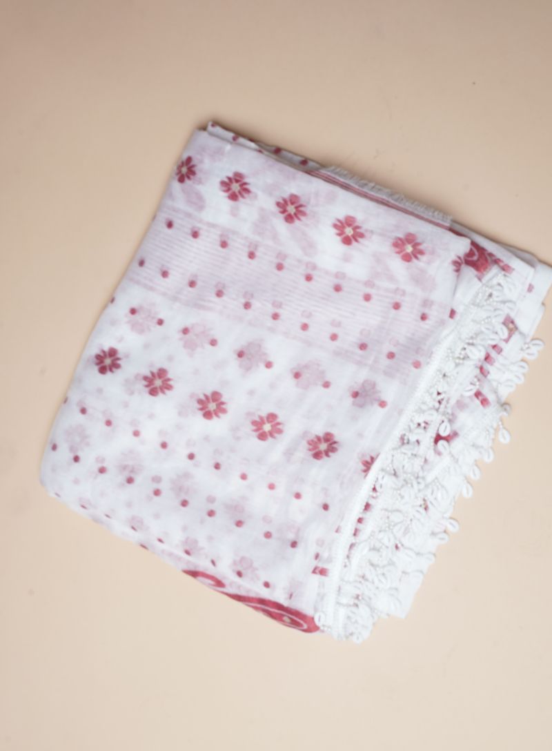 The traditional Kodi (shell) work adds a unique handcrafted charm, while the bold red accents create a beautiful contrast against the white base. Perfect for festive occasions, cultural events, poojas, and traditional celebrations, this saree reflects simplicity, grace, and ethnic sophistication.