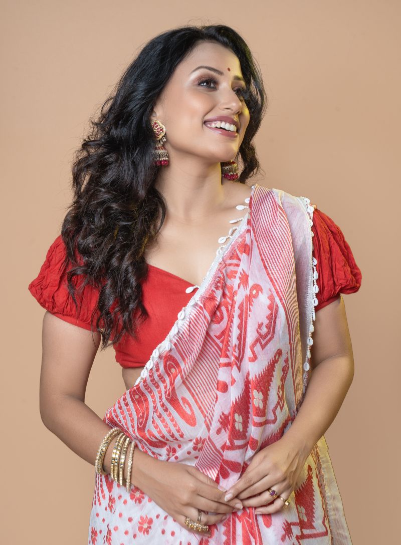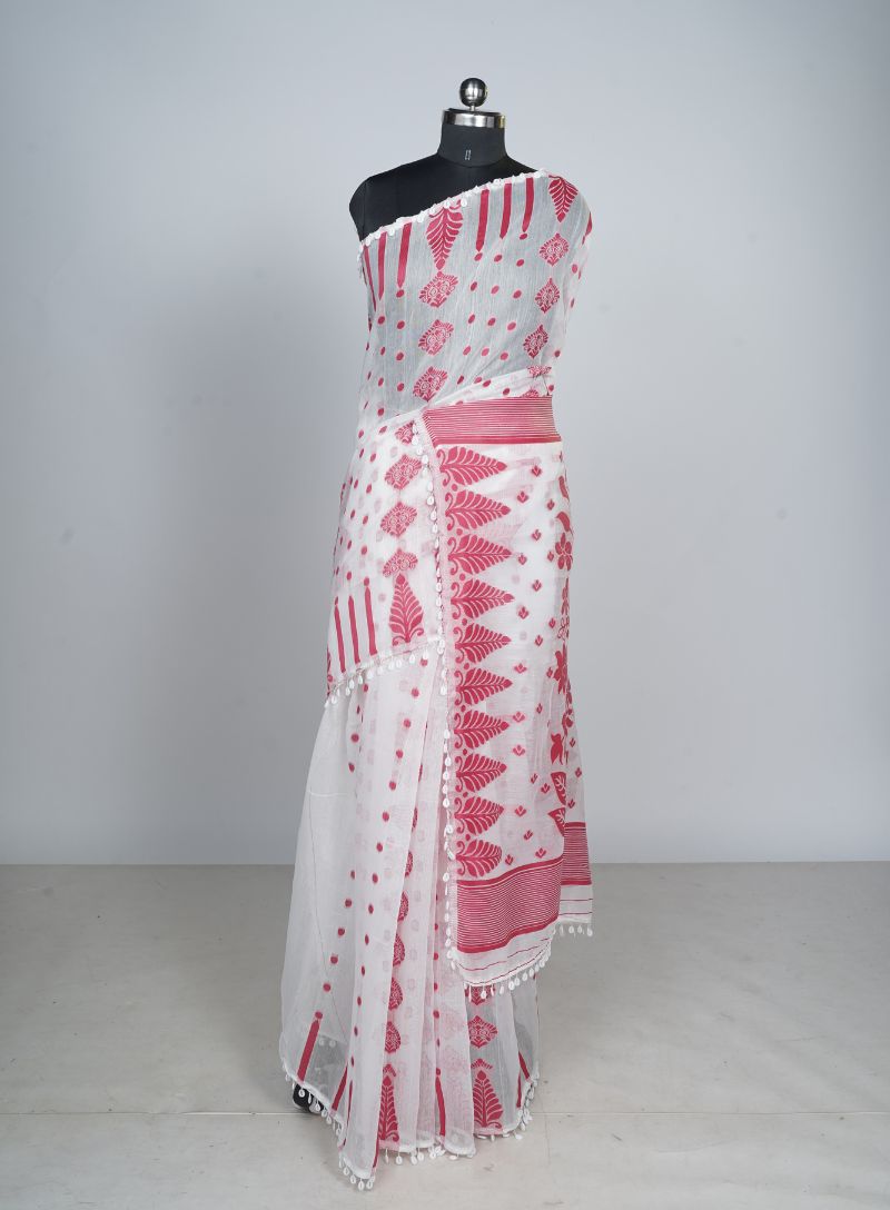 Experience the elegance of heritage weaving with this exquisite Handloom Jamdani saree in pristine white, enhanced with striking red Kodi work. Handwoven by skilled artisans, the Jamdani fabric is known for its lightweight feel, airy texture, and intricate craftsmanship.