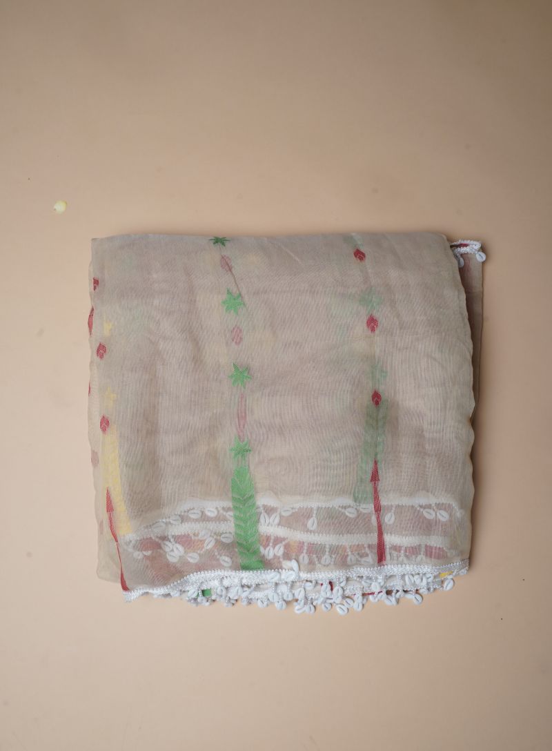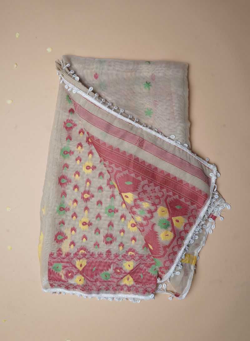 Embrace timeless craftsmanship with this elegant Handloom Jamdani saree in a warm beige tone, adorned with striking red Kodi (shell) work. Handwoven by skilled artisans, the Jamdani fabric is celebrated for its lightweight texture, airy weave, and intricate detailing.
