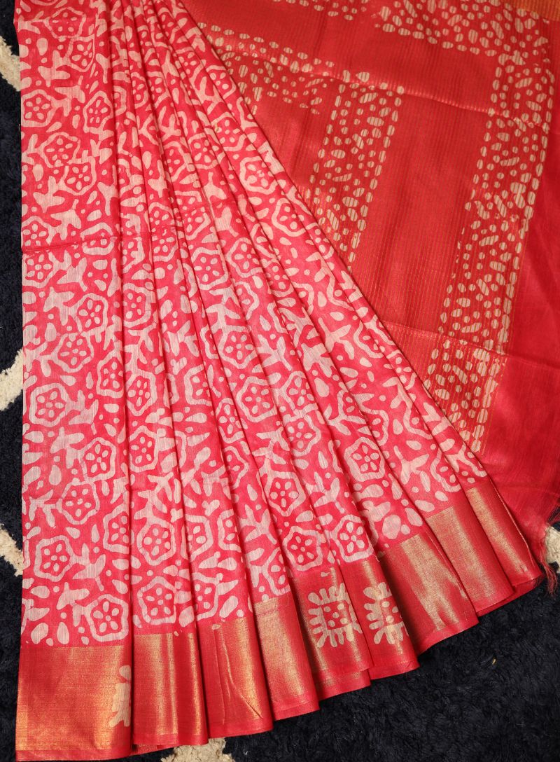 The traditional batik print lends an artisanal, earthy appeal, while the shimmering zari border enhances the saree with subtle richness. Perfect for festive occasions, cultural events, office wear, and graceful day or evening gatherings, this saree blends heritage craftsmanship with contemporary elegance.