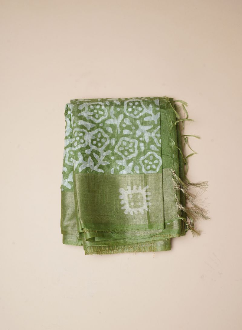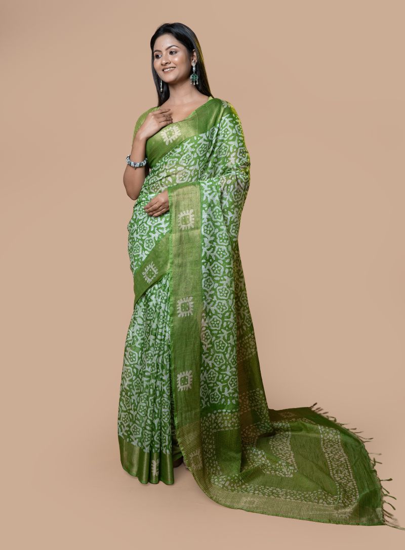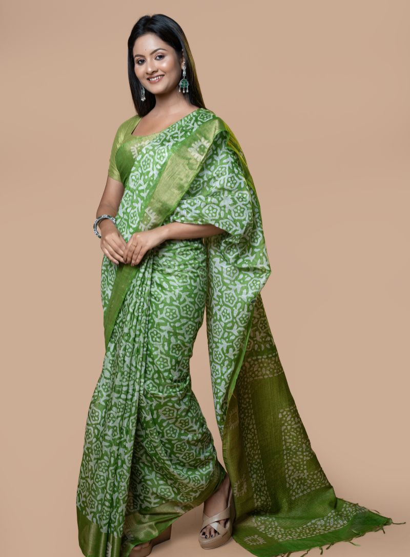 Elevate your ethnic wardrobe with this elegant Handloom Linen saree in a refreshing green shade, adorned with an allover batik print and finished with a refined zari woven border. Woven from premium handloom linen, the saree offers a lightweight, breathable feel with a crisp yet comfortable drape, perfect for all-day wear.