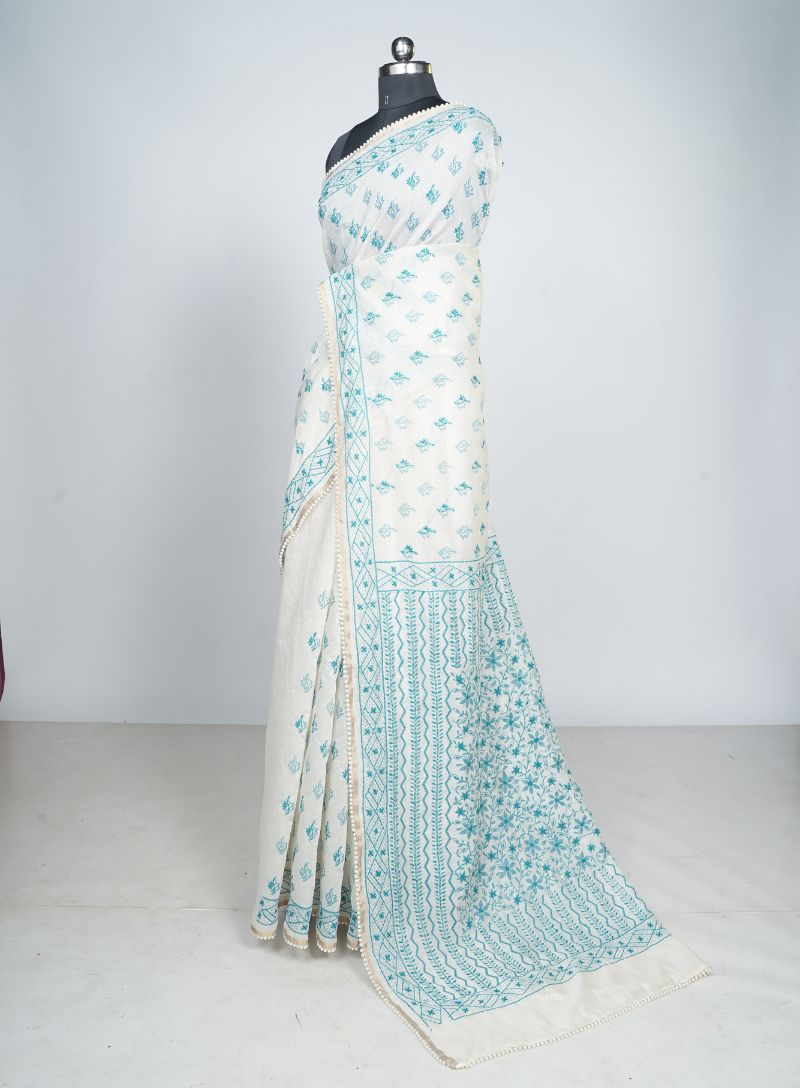 The traditional Lambani work, inspired by folk artistry, adds depth and character while perfectly complementing the calm sea blue base. Ideal for festive occasions, weddings, cultural events, and elegant daytime functions, this saree blends heritage craftsmanship with understated sophistication.