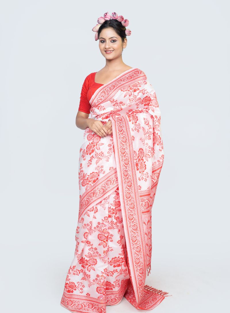 The striking contrast of pristine white with rich red adds a traditional and festive appeal, making this saree perfect for weddings, festive occasions, poojas, and cultural celebrations. Its understated elegance allows the beauty of the silk to shine, while the colour palette keeps the look timeless and versatile.