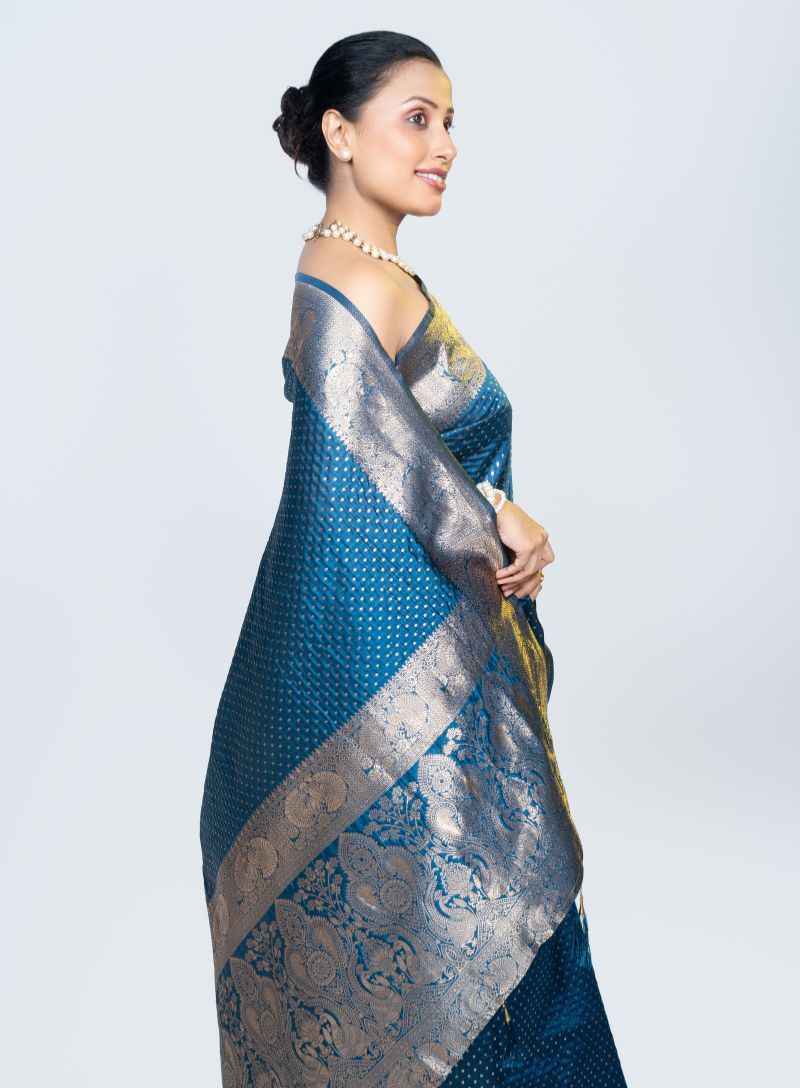 The delicate buta motifs, spread evenly across the saree, add traditional elegance and depth while maintaining a refined aesthetic. The deep blue shade lends a royal appeal, making it perfect for weddings, festive occasions, evening celebrations, and cultural events.