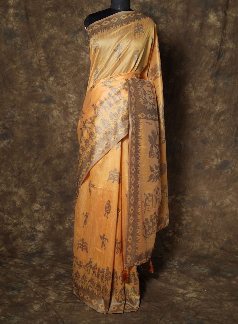 The iconic Warli art, rooted in tribal storytelling, adds a unique cultural narrative to the saree, making it truly distinctive. The bright yellow base lends an auspicious and festive charm, making this saree perfect for festive occasions, cultural events, art celebrations, poojas, and special gatherings.