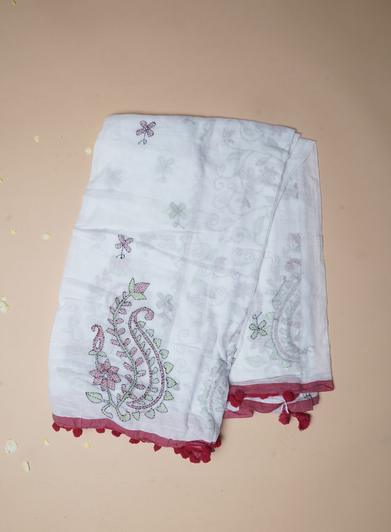 Celebrate understated elegance with this beautiful Mul Cotton saree in a pristine white base highlighted with vibrant red accents, adorned with fine embroidery work. Crafted from ultra-soft mul cotton, the saree offers a feather-light feel, excellent breathability, and a comfortable drape—perfect for effortless all-day wear.