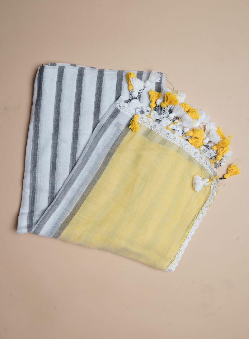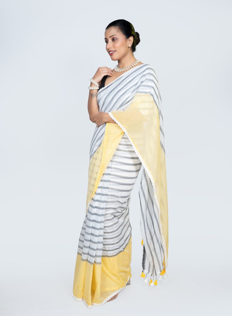 Step into effortless elegance with this beautiful Mul Cotton saree on a crisp white base, adorned with horizontal stripe prints in soothing grey and vibrant yellow. Crafted from ultra-soft mul cotton, the saree is feather-light, breathable, and comfortable, making it ideal for all-day wear.