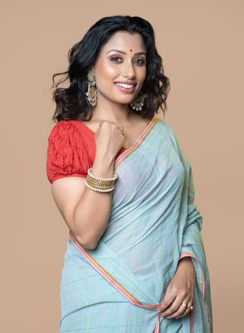 The hand-done Kantha embroidery adds subtle texture and artisanal character, reflecting timeless craftsmanship. The calm light blue hue lends a soothing, understated charm, making this saree ideal for day events, cultural gatherings, casual festivities, office wear, and everyday ethnic styling.