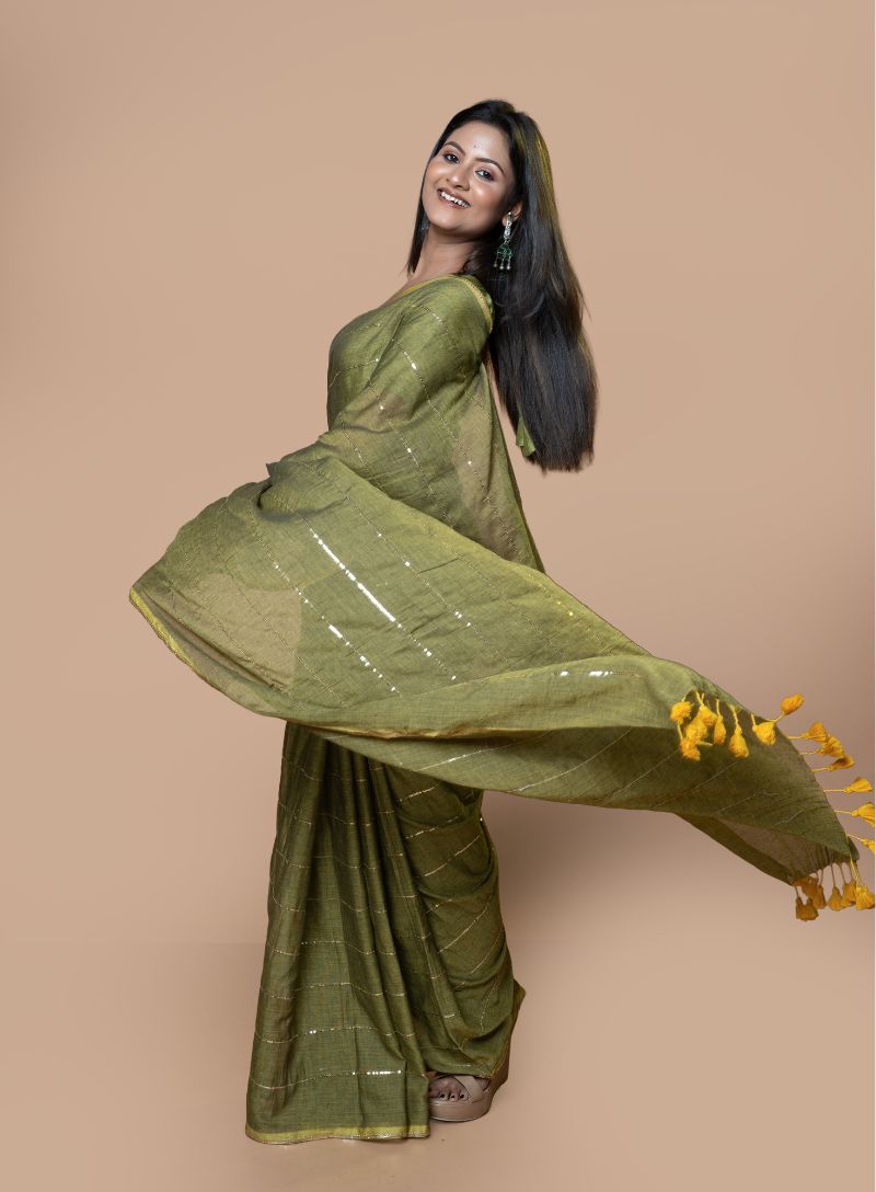 Add a touch of understated glamour to your wardrobe with this elegant Mul Cotton saree in a rich dark golden hue, enhanced with delicate sequence work. Crafted from soft mul cotton, the saree offers a feather-light feel, excellent breathability, and a comfortable, easy drape—ideal for long hours of wear.
