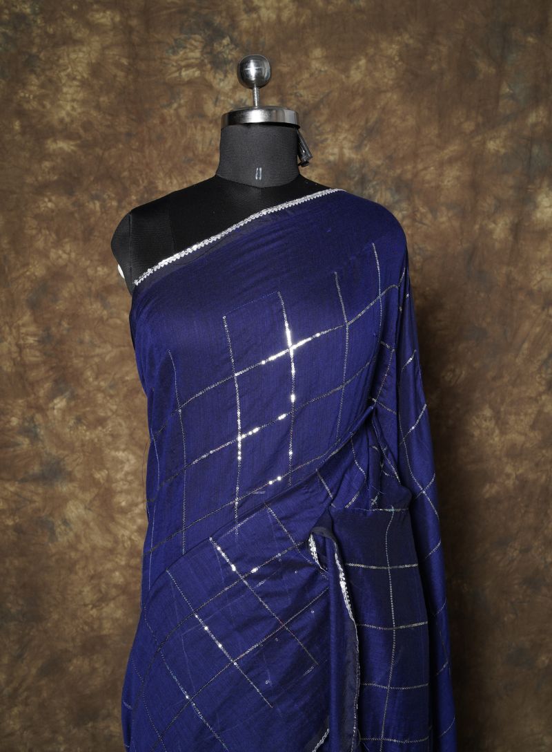 The subtle sequence embellishments add a gentle shimmer without overpowering the look, striking the perfect balance between simplicity and elegance. The rich navy blue colour lends a timeless charm, making this saree ideal for festive occasions, evening gatherings, small celebrations, and elegant day-to-night wear.