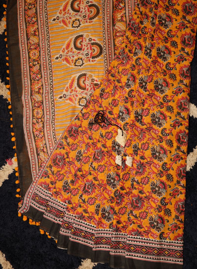 Bring warmth and artisanal charm to your wardrobe with this beautiful Pure Cotton printed saree in mustard yellow and brown, enhanced with delightful pompom detailing. Crafted from soft, breathable pure cotton, the saree offers a lightweight feel and a graceful drape—perfect for all-day comfort.