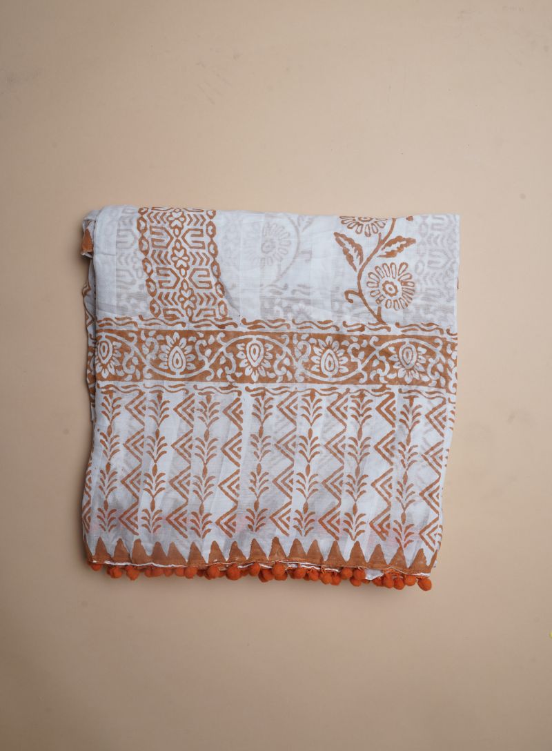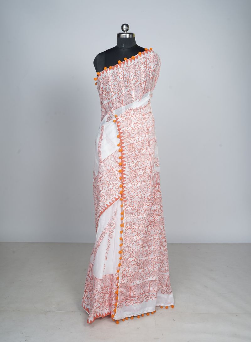 Add a pop of colour to your everyday ethnic wardrobe with this beautiful Pure Cotton saree on a crisp white base, adorned with lively orange block prints and finished with charming pompom lace detailing. Crafted from soft, breathable pure cotton, the saree offers exceptional comfort and an easy, graceful drape—perfect for warm days.