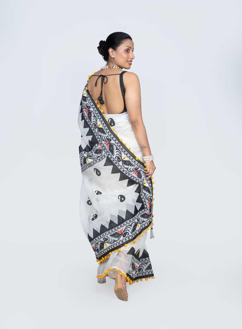 The handcrafted applique motifs add subtle depth and artisanal charm, while the monochrome palette lends a modern yet timeless appeal. Ideal for day events, cultural gatherings, office wear, festive occasions, and elegant casual styling, this saree blends traditional craftsmanship with contemporary elegance.