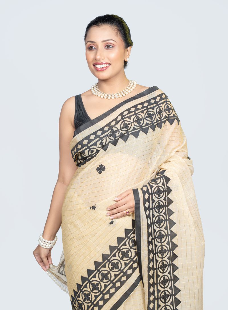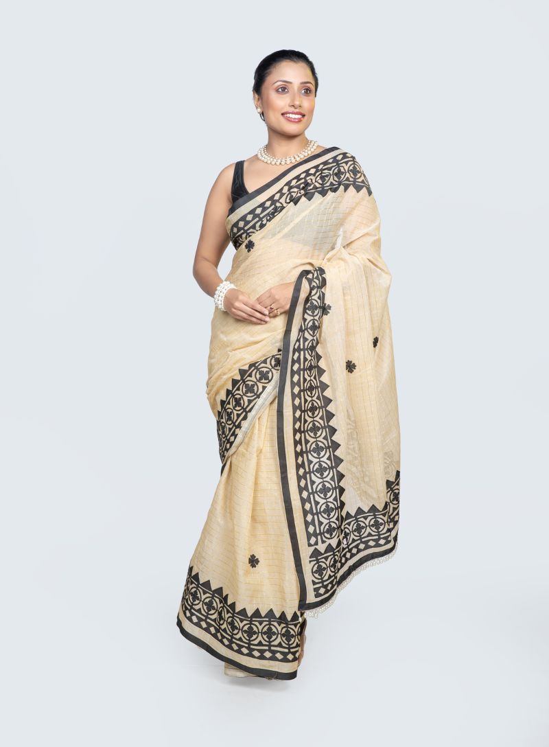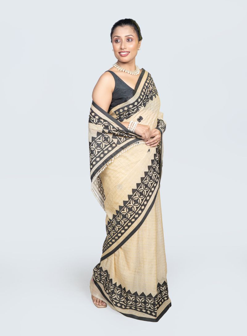 The handcrafted applique motifs add subtle artisanal detail, while the neutral beige paired with bold black creates a classic, versatile appeal. Ideal for day events, cultural gatherings, office wear, festive occasions, and elegant casual styling, this saree blends traditional craftsmanship with modern grace.