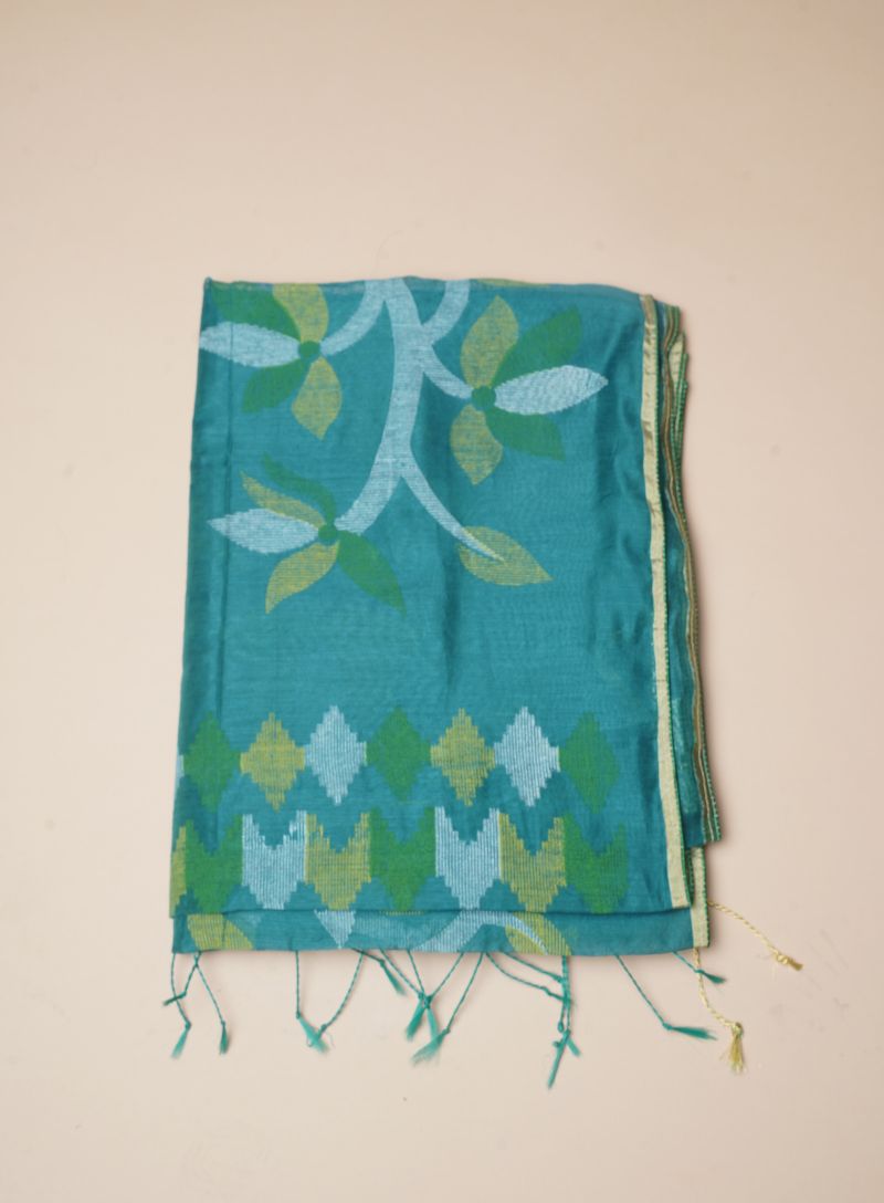 Bring home timeless artistry with this elegant Tussar Cotton Jamdani saree in a refreshing green base, beautifully enhanced with the traditional Madhobi Lata floral design in vibrant multicolour tones. Crafted from a fine blend of tussar and cotton, the saree offers a soft texture, natural sheen, and breathable comfort—ideal for all-day wear.